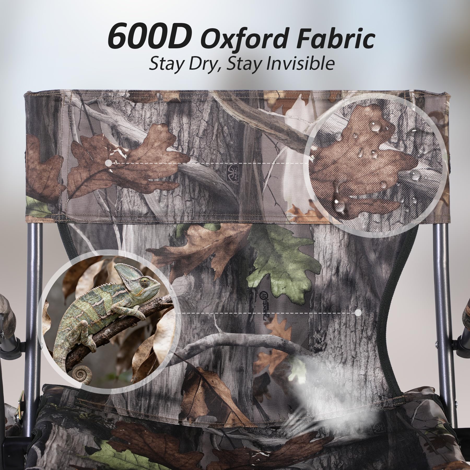 Sturdy & Reinforced Build Constructed with a robust, widened metal frame and stable 600D Oxford fabric, this foldable hunting chair offers exceptional breathability, comfort, and support. It supports up to 330 lbs and comes with softly padded armrests for enhanced relaxation.