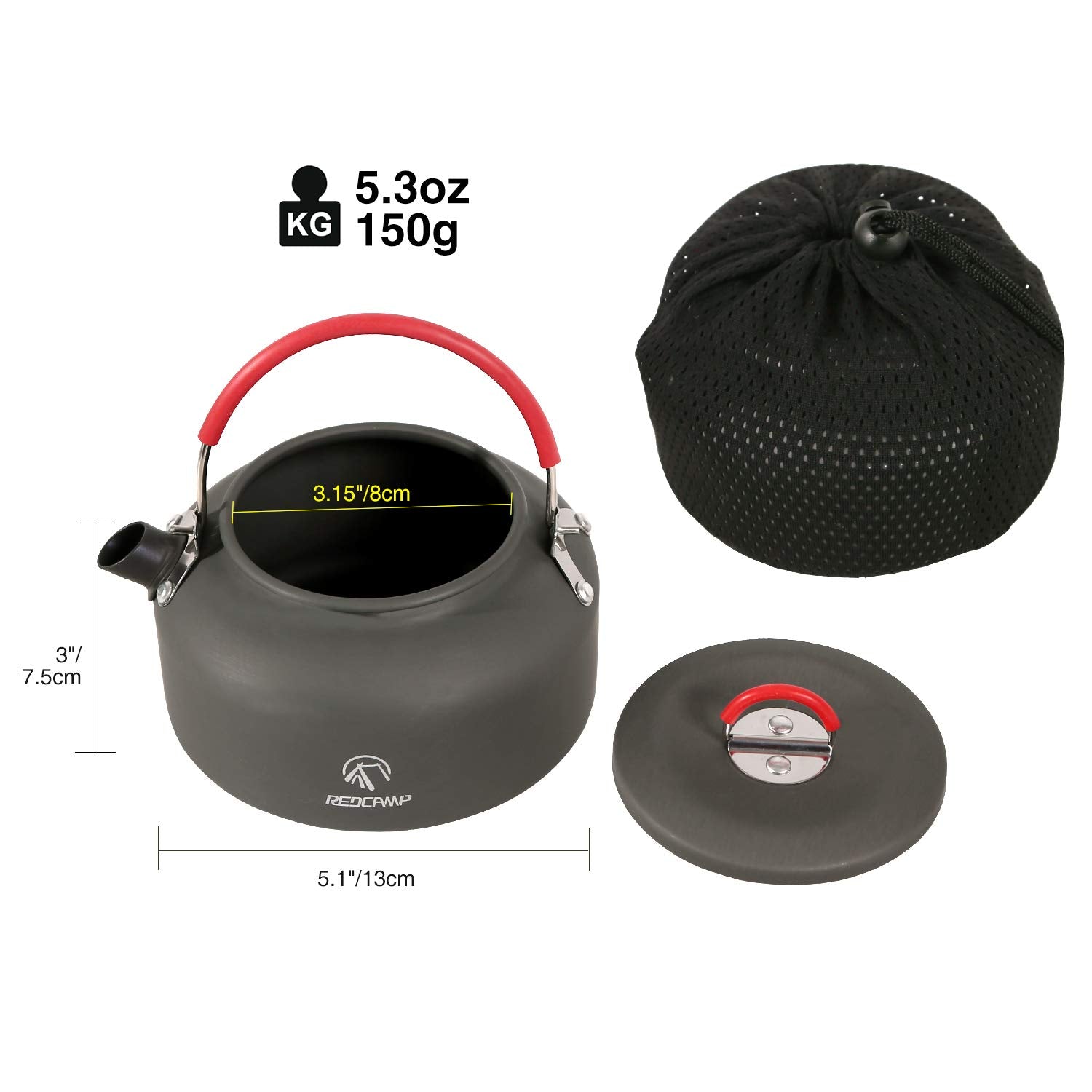 Designed for camping and backpacking, the kettle is lightweight and compact. A mesh carrying bag is included for easy storage and transport.