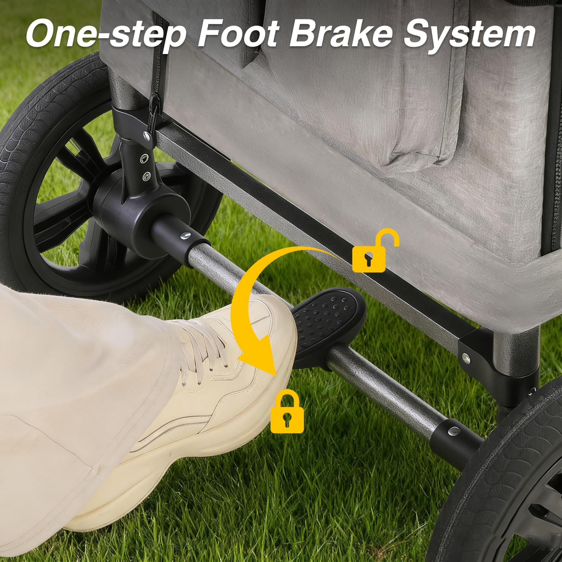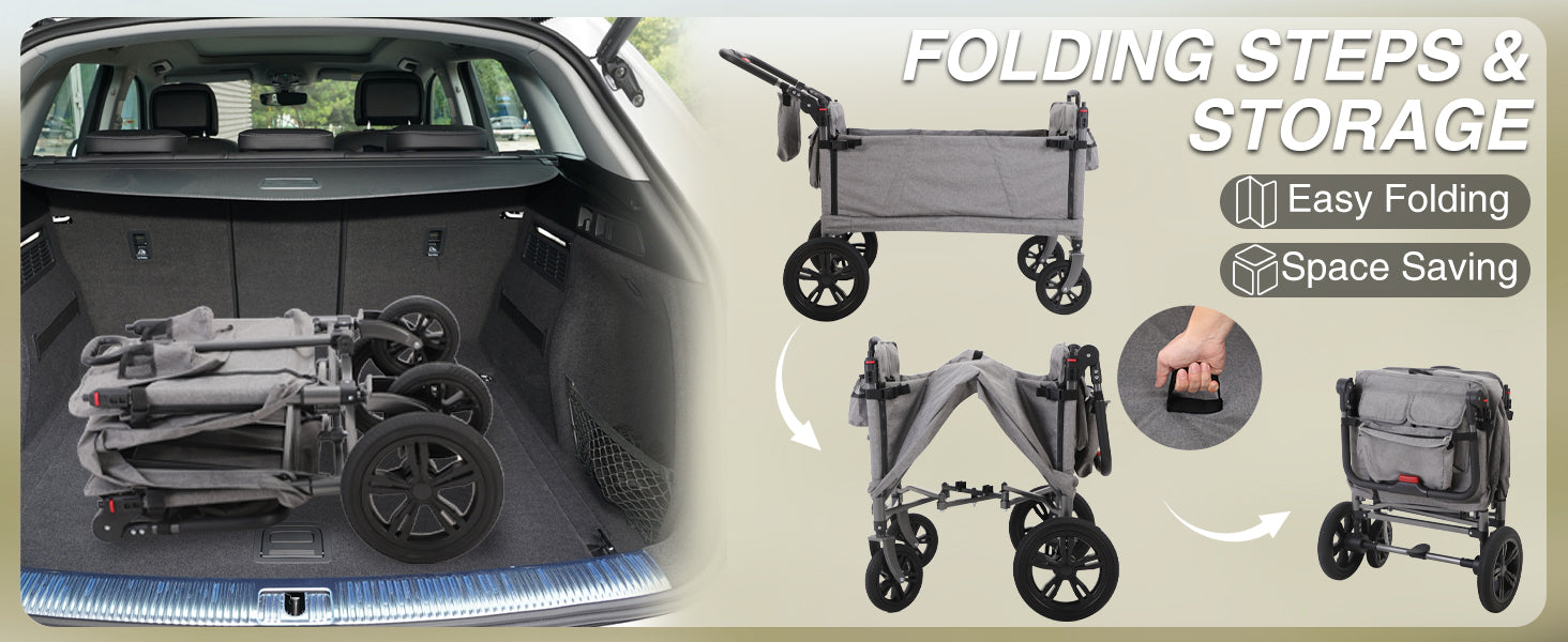 Beyond passenger comfort, this wagon is an logistical powerhouse. The large, shock-absorbing wheels—7.3” swivel front and 12” rear—glide over pavement and gravel alike. When the day is done, the entire unit folds down in seconds to a compact size that fits easily into car trunks, with no tools required. Whether you are heading to the supermarket, a camping trip, or a neighborhood BBQ, this wagon simplifies the journey.