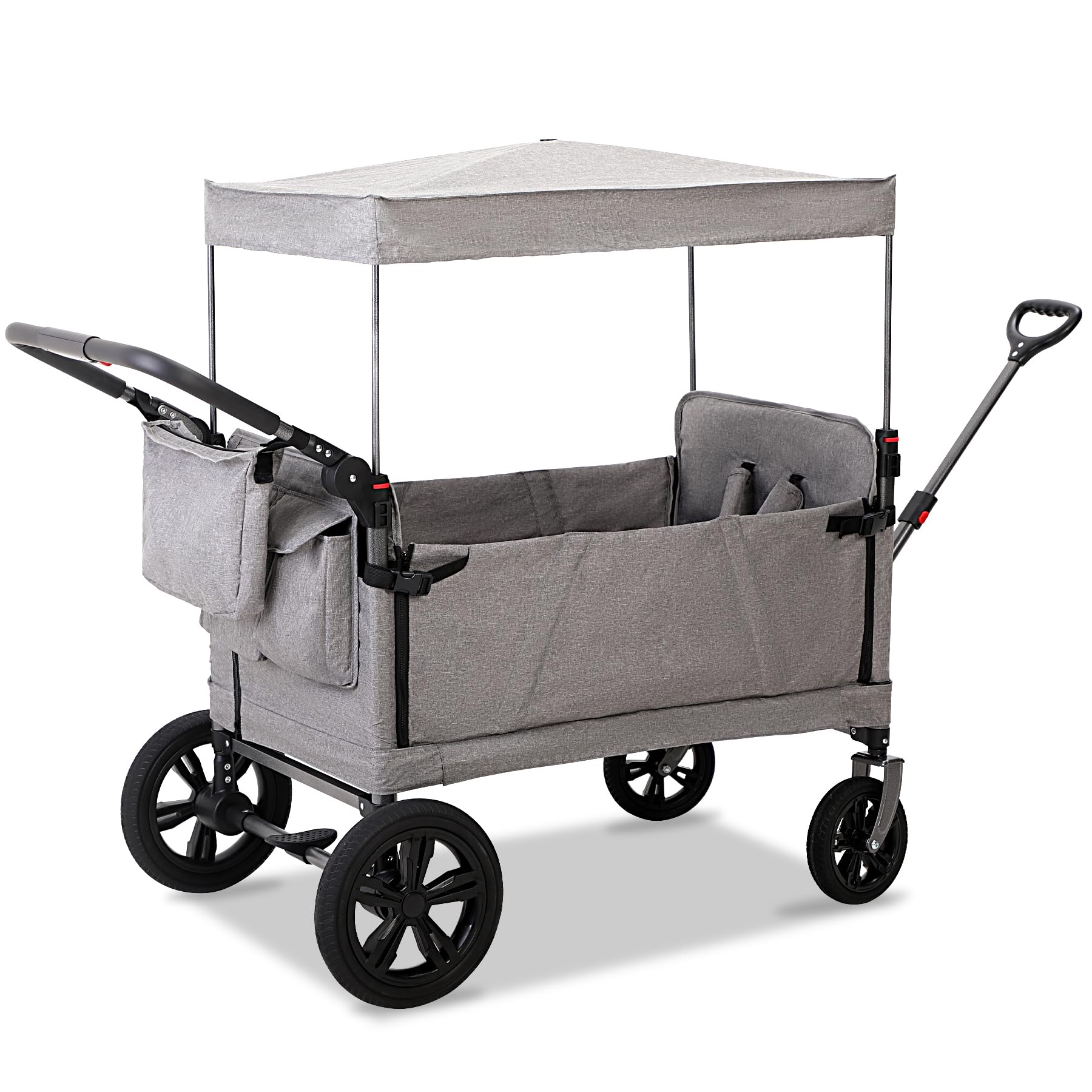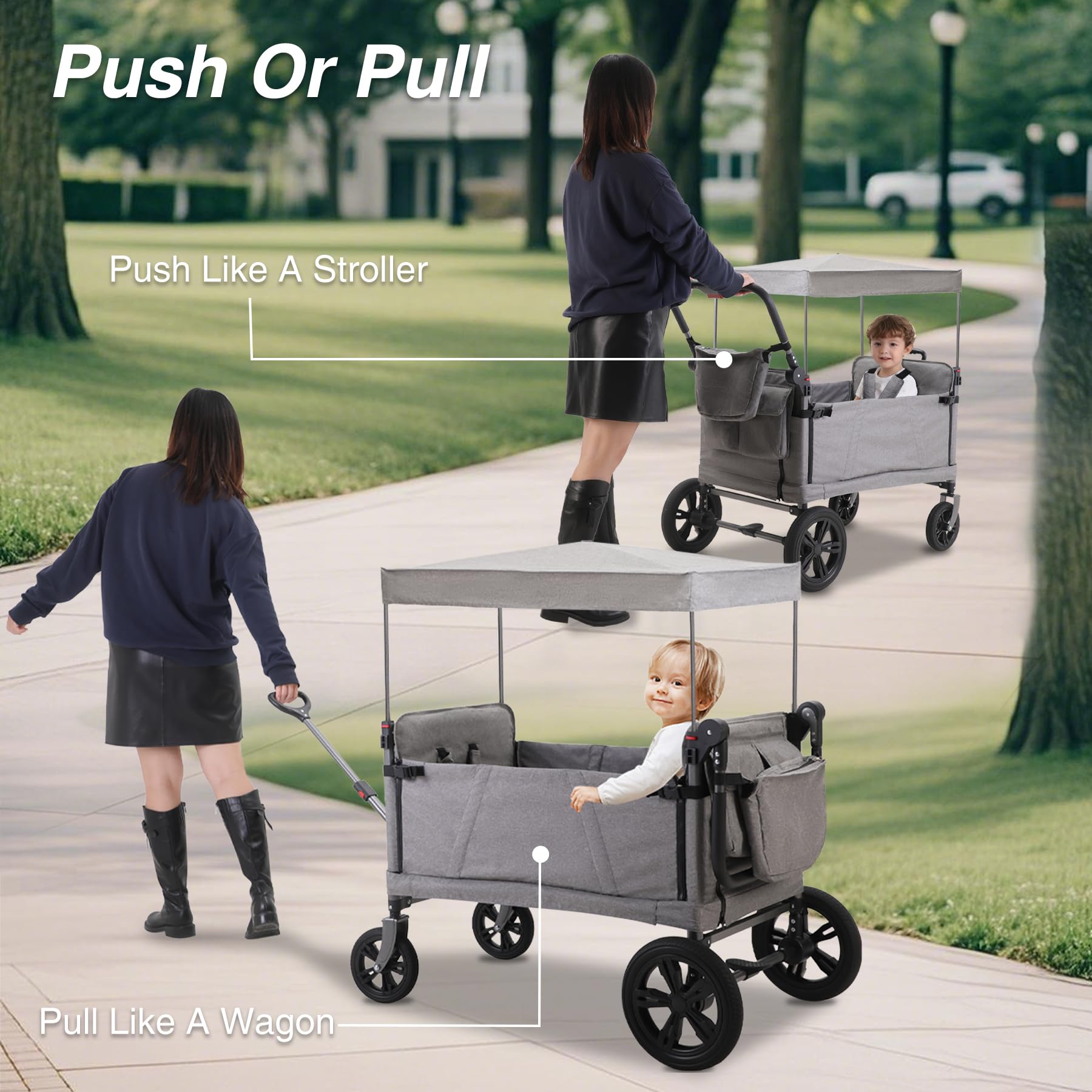 • Push & Pull Handles Adjustable front bar for stroller-style pushing and a telescopic rear handle for easy wagon pulling.